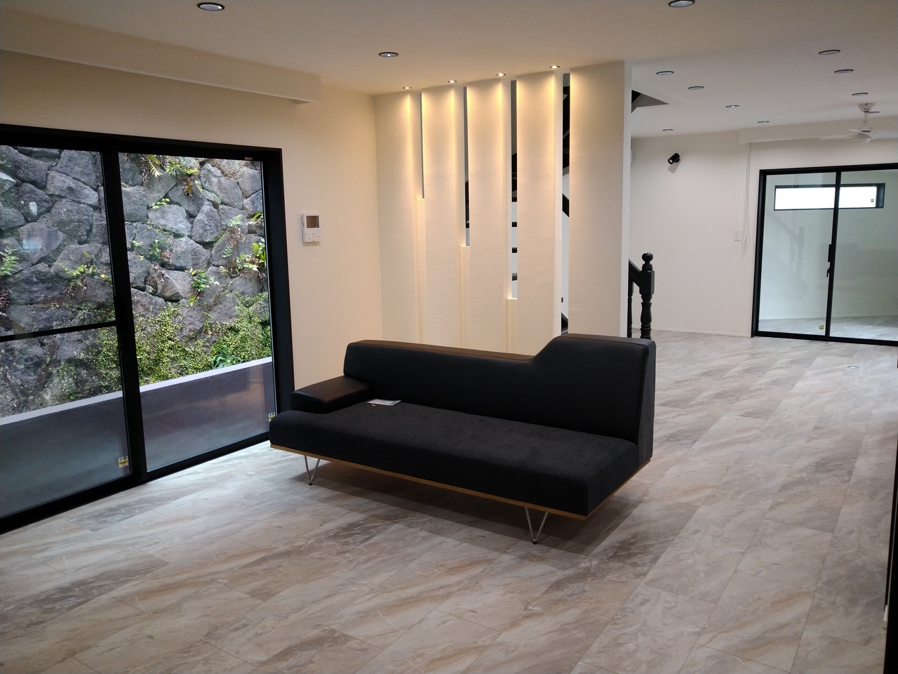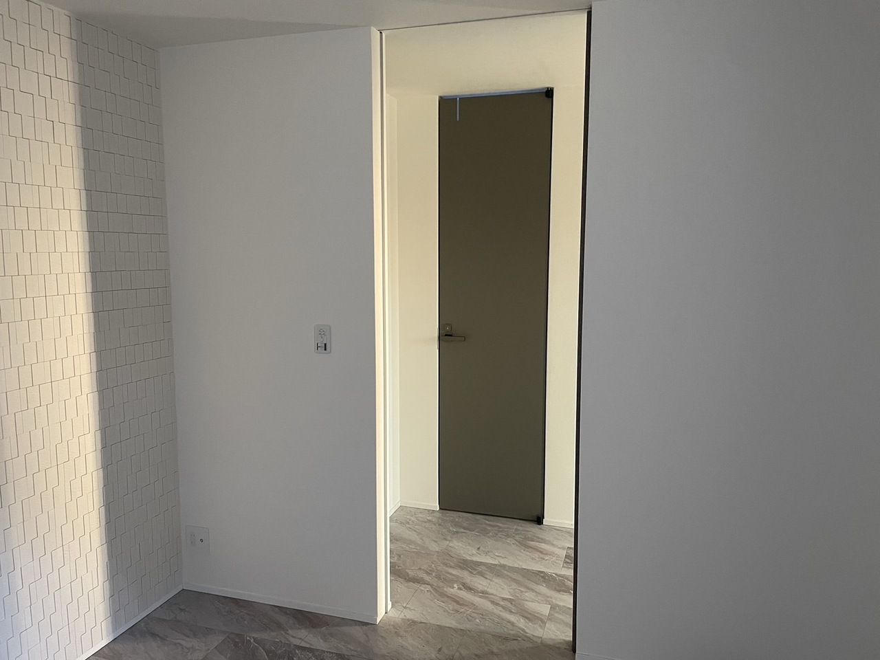 玄関からの光がLDKに届き、石目調の床を照らしています。