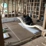 特注したRの框にフローリングを張っています。